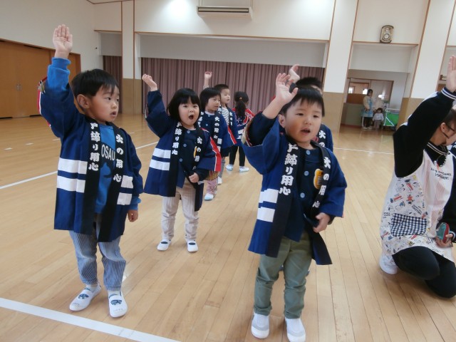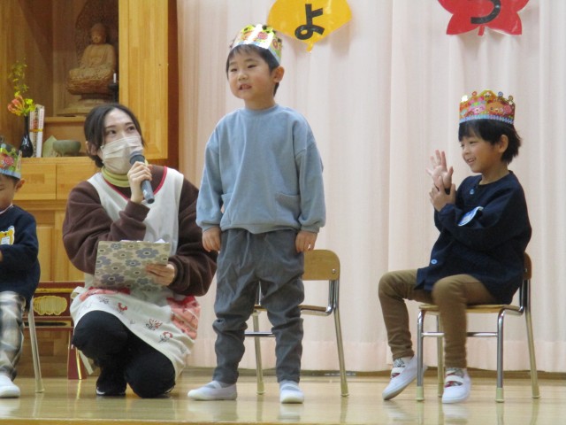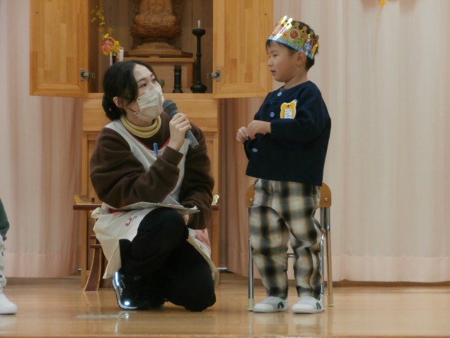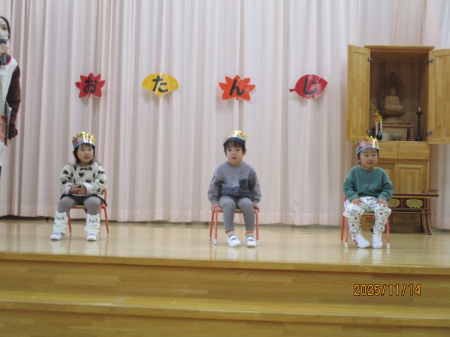 11月の誕生会(七五三のお祝い)を行いました。ステージ上で11月生まれのお友達は元気いっぱいにインタビューに答えてくれました。