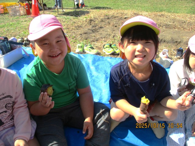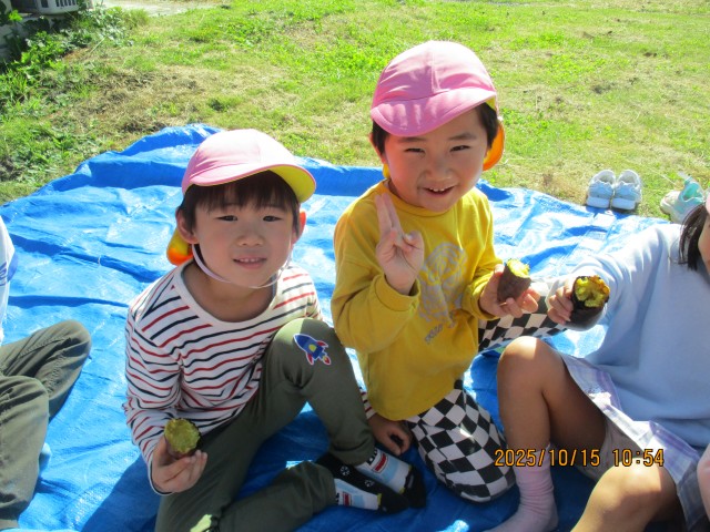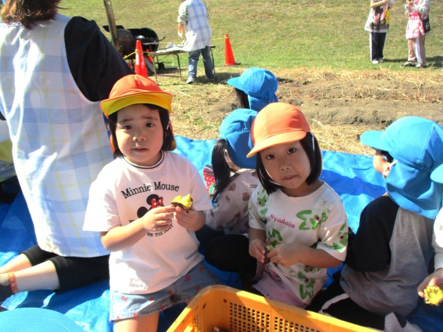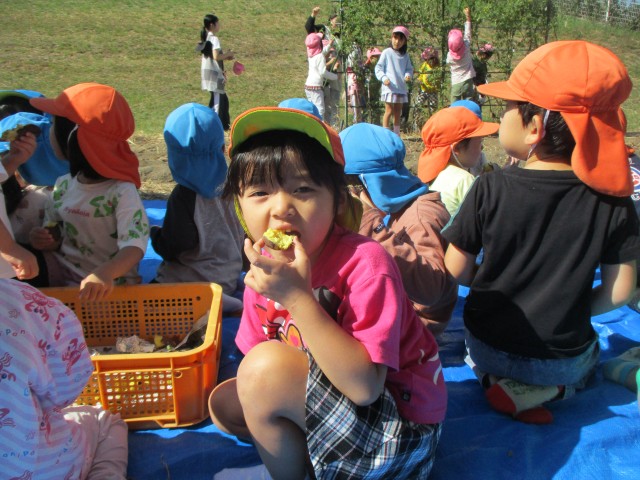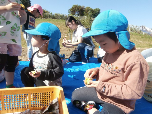 完成した石焼き芋は、ちゅうりっぷ・たんぽぽ・さくら組のみんなで食べました。とても甘くて美味しい焼き芋を食べて、子ども達の笑顔が溢れていました!
