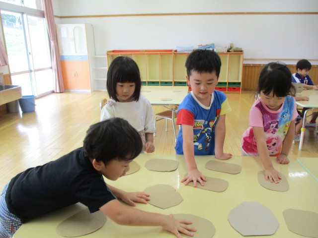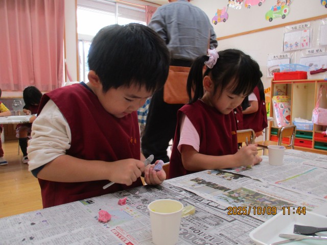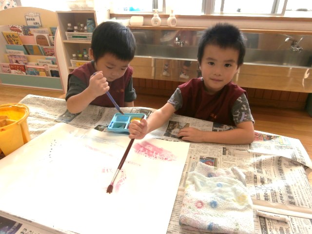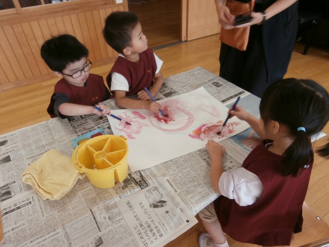 今日は全クラス創造教室に参加しました。手で触れる感触を楽しんだり、色の混ざり方に気付いたりなど、どのクラスも講師の妙鏡先生のお話を聞きながら、集中して活動に取り組んでいました!