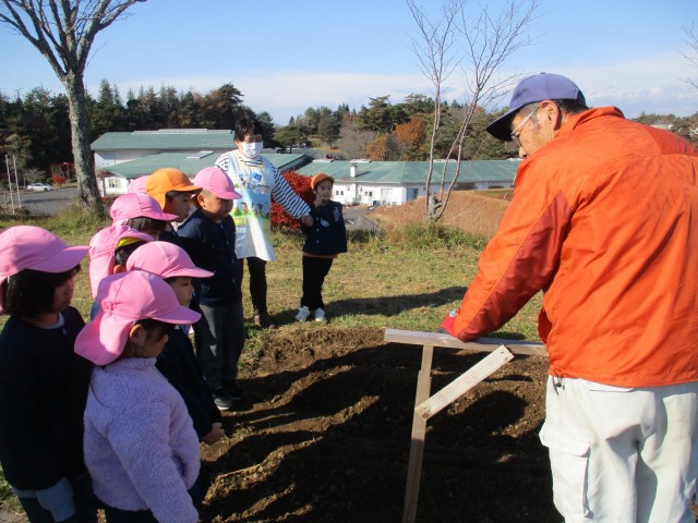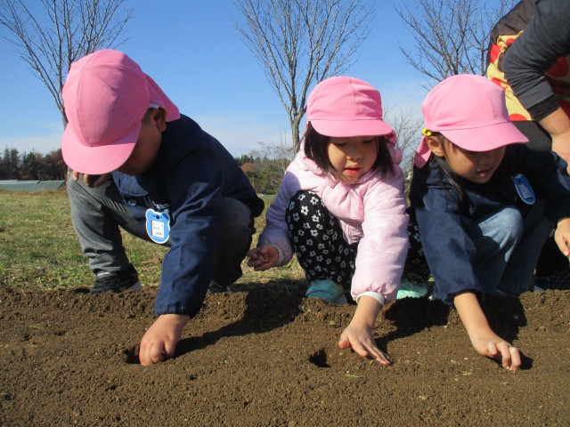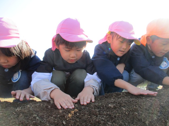 さくら組の子どもたちが、こども園入口の道路脇にちゅうりっぷの花の球根を植えました。保育教諭や用務員の武田さんのお話をよく聞いて土の中に球根を植えることが出来ました。