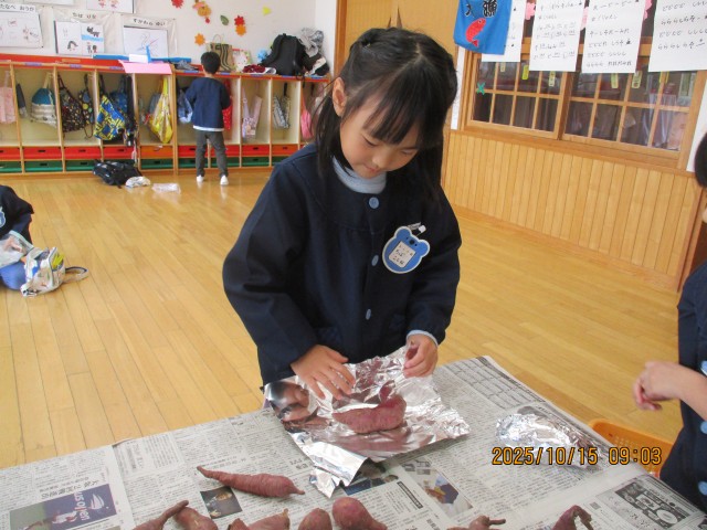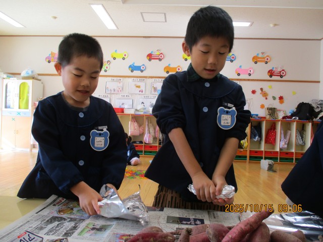 今日は、園の畑で育てたさつまいもで石焼き芋を作りました。さくら組の子どもたちが、さつまいもをアルミホイルで包むお手伝いをしてくれました。