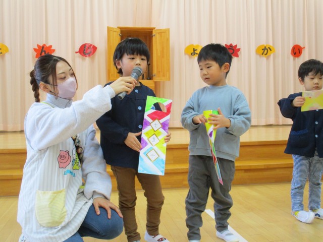 また、各クラスで製作した千歳飴の袋の紹介も行いました。どのクラスもとても素敵な作品が完成しました!以上児クラスのお友達は自分たちで千歳飴の袋を紹介してくれました。