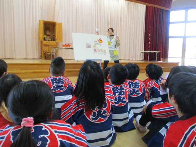 また、「火事の時の避難の仕方」についてのパネルシアターを真剣に見ていた子ども達。火の危険性と避難の仕方を学ぶことが出来ました。