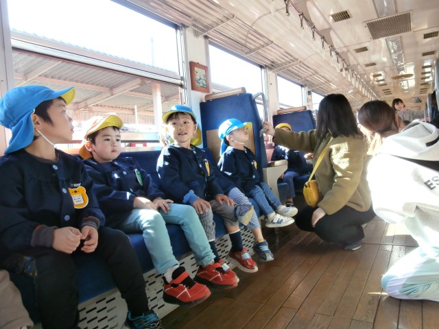 最後に実際に動く車両に乗せてもらいました。「出発進行!」の掛け声とともに動く車両に大興奮の子ども達でした!また、園に帰ってからはみんなで楽しくお弁当を食べました。