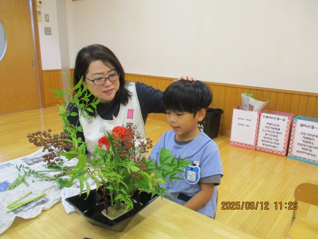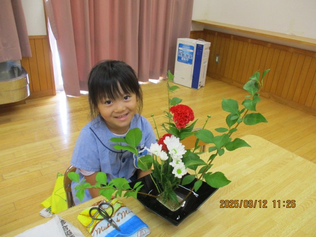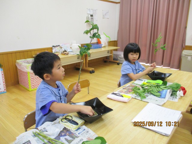 しっかりとお話を聞いて落ち着いて参加していたさくら組さん。いけばなで使用するお花を見て「綺麗」「良いにおいがする」と言いながら、いけばなを楽しんでいました。また、お友達の作品を見ながら褒め合う姿にほっこりと温かい気持ちになりました!