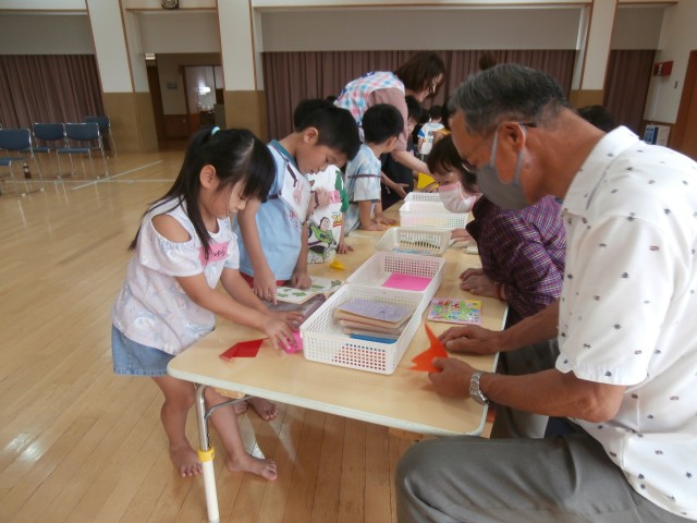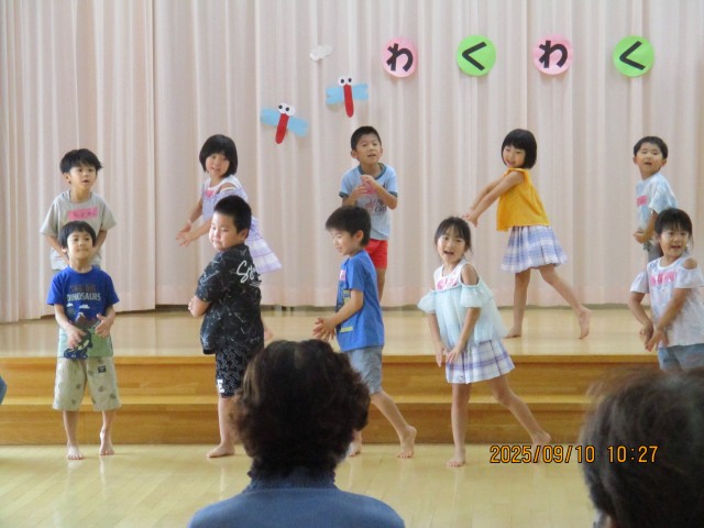 涌津市民センターさん共催で涌津の地域の方々との交流会がありました。はじめにたんぽぽ組・さくら組の子ども達が歌や踊りの発表を行いました。とても元気な歌声と踊りで、地域の方々も楽しそうに見ていました。